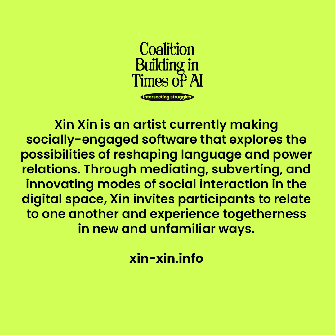 Xin Xin is an artist currently making socially-engaged software that explores the possibilities of reshaping language and power relations. Through mediating, subverting, and innovating modes of social interaction in the digital space, Xin invites participants to relate to one another and experience togetherness in new and unfamiliar ways.